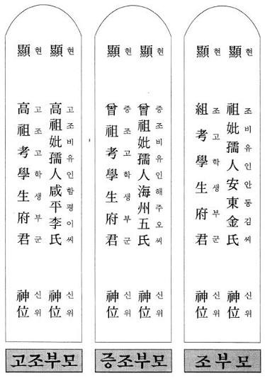 | 할아버지 | 顯考 祖考府君之位 | 현고 조고부군지위 | 돌아가신 할아버지 |