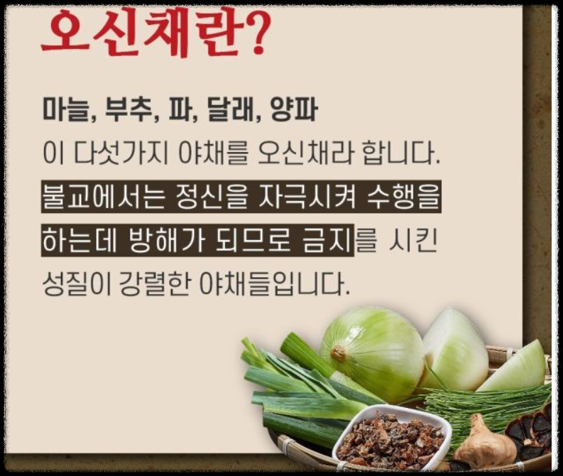 - 종류: 달래, 달래, 평고, 자갓, 무릇 등 시대와 지역에 따라 다르지만 보통 맵고 자극적인 채소를 썼습니다.