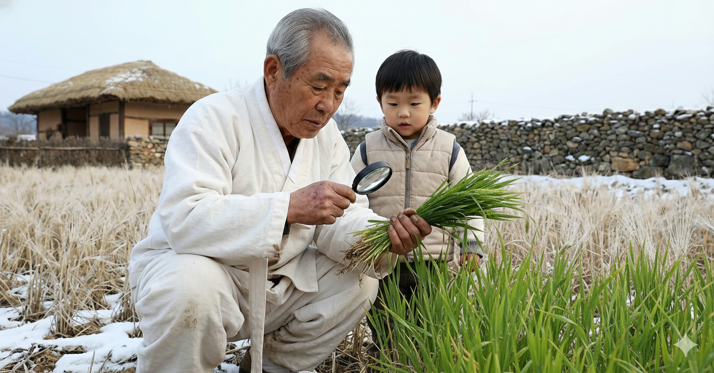 - 해설: 뿌리가 세 가닥 이상이면 풍년, 두 가닥이면 평년, 한 가닥이면 흉년이 들 것이라고 믿었습니다. 조상님들에게 보리는 겨울을 이겨낸 생명력의 상징이었기 때문이죠.