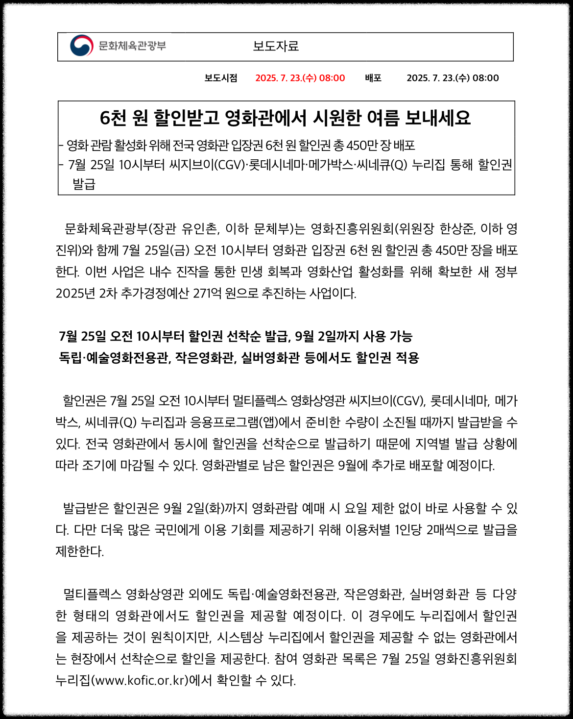 2025년 7월 31일에는 정부의 6천 원 지원으로 관객은 1천 원만 부담하면 됩니다.